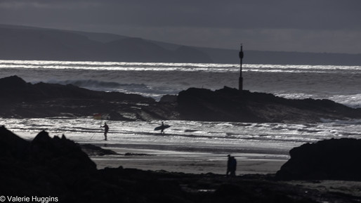 As you can imagine, after that initial surprise, sorting out the camera settings and working out the practicalities absorbed most of the morning for me. Never mind the quality of the images, I wanted to learn the basics. And Valda was on hand as I struggled through. The other challenge was that I had not been to Bude for many a long year, and so the photographic possibilities were exciting me and I wanted to capture lots of 'record' shots too! The surfers on the wide, golden beach, the waves against the rocks, the colourful beach huts, and later in the day, the low sun creating amazing silhouettes and light splashes on the sea. I had to remind myself why I was there and resist going off on a tangent.