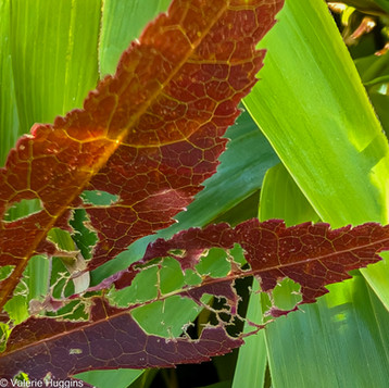 And, the larva munching the red acer leaves had created amazing patterns and contrasts with the green foliage behind: